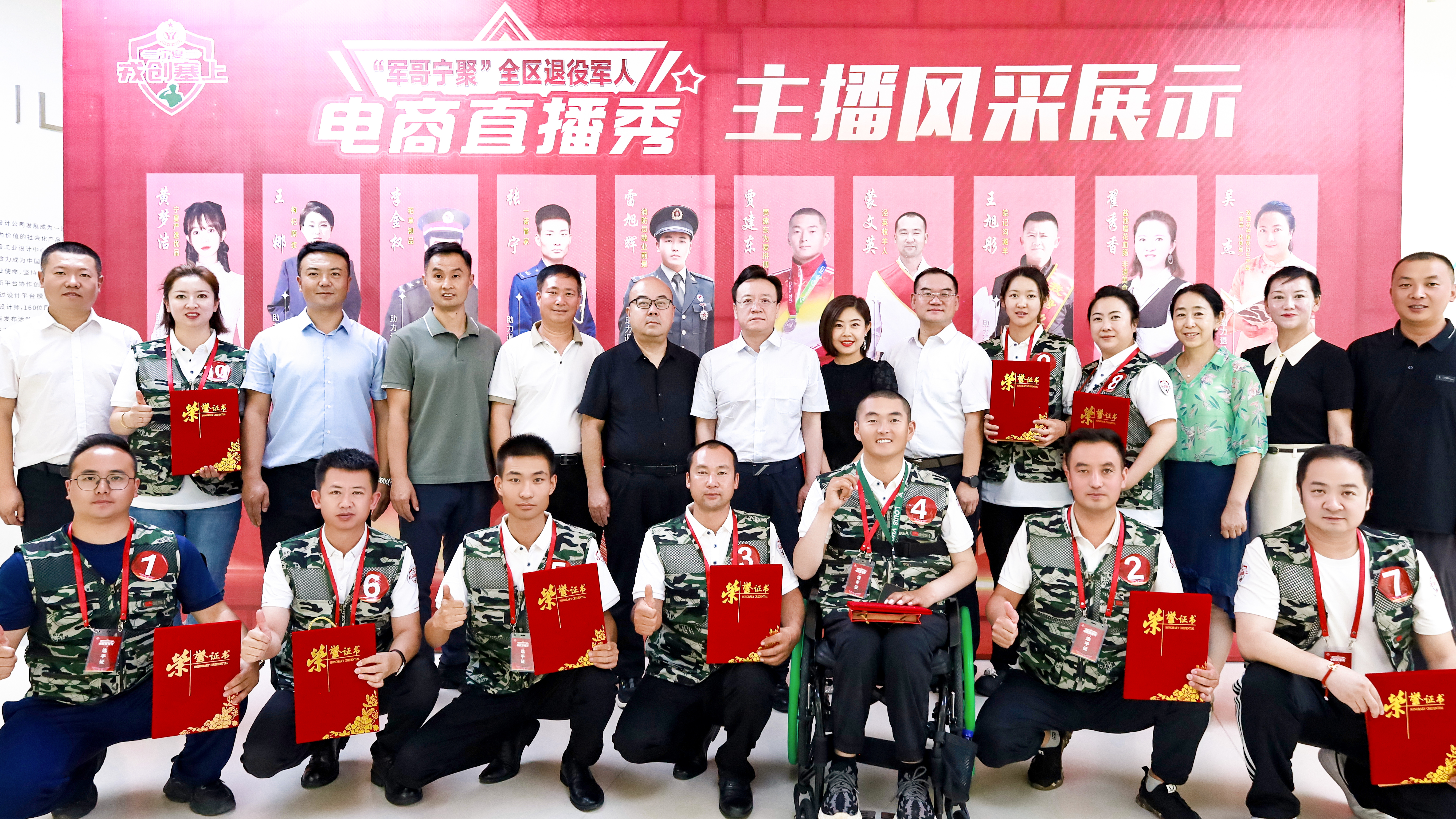 为展现退役军人电商直播风采,助力退役军人创业创新,挖掘全区范围内具有潜力和影响力的优秀退役军人电商从业者、电商企业,提升“军哥宁聚”宁夏退役军人电商品牌知名度和影响力,7月9日,由自治区退役军人事务厅主办的“军哥宁聚”全区退役军人电商直播秀活动在银川电商直播公共服务基地拉开帷幕,退役军人事务厅党组成员、副厅长海国,自治区党委网信办、人力资源和社会保障厅、农业农村厅、商务厅等相关单位领导出席活动并为获奖选手颁奖。